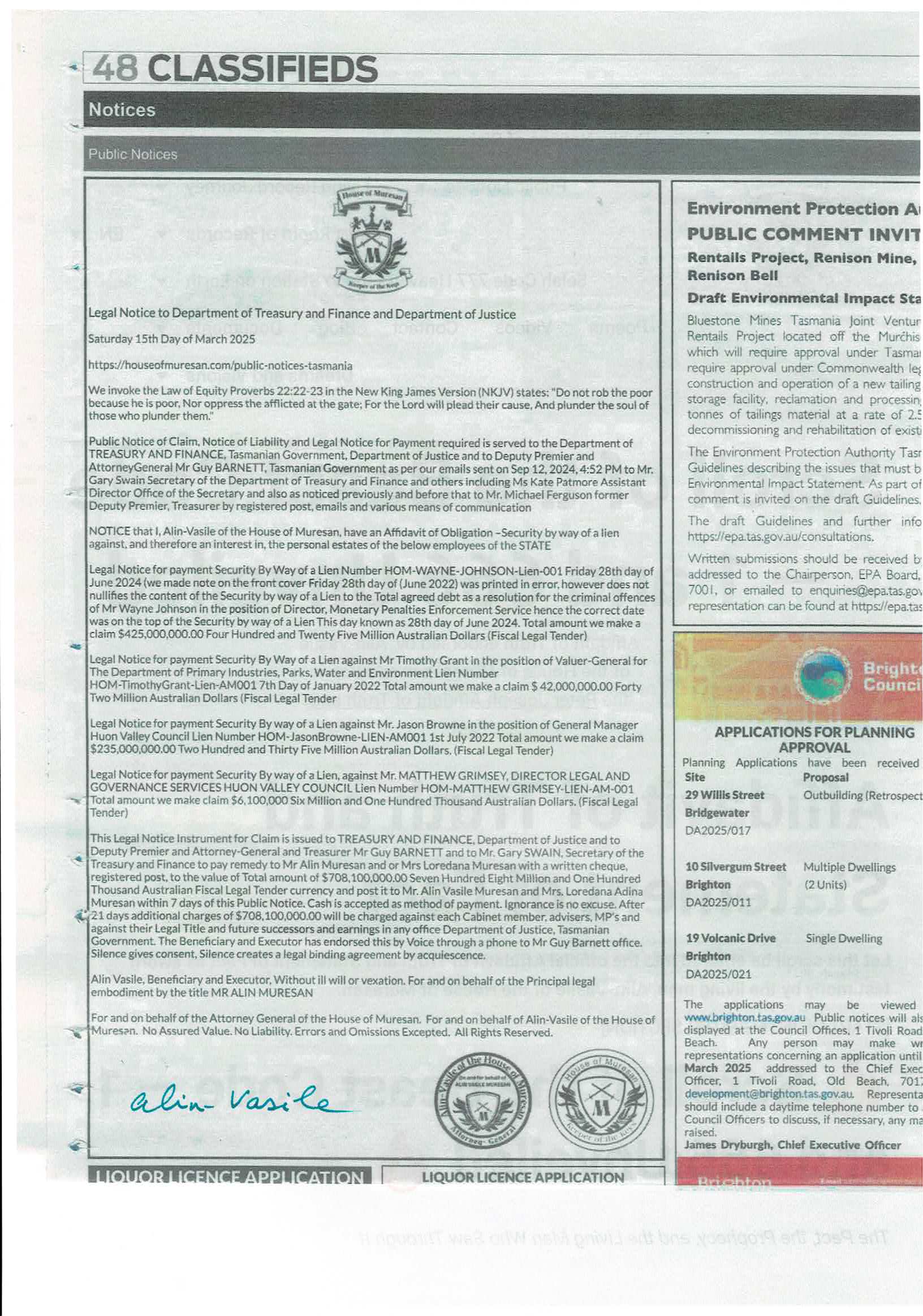 The total sum of $13.7 Billion AUD was established and perfected through the Public Notice in THE MERCURY (15 March 2025). This value was further evidenced and collateralized via the Personal Property Securities Register (PPSR), identifying the specific fiduciaries who accepted the debt through their unrebutted silence.